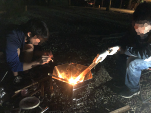 キャンプといえば、やはりキャンプ飯!初日のキャンプ飯は結構、ハードでした。フライパンの取っ手を忘れてしまって、ガックシしました。スーパーでO君がバンバン買ったものをジュージュー焼いていっていきました。